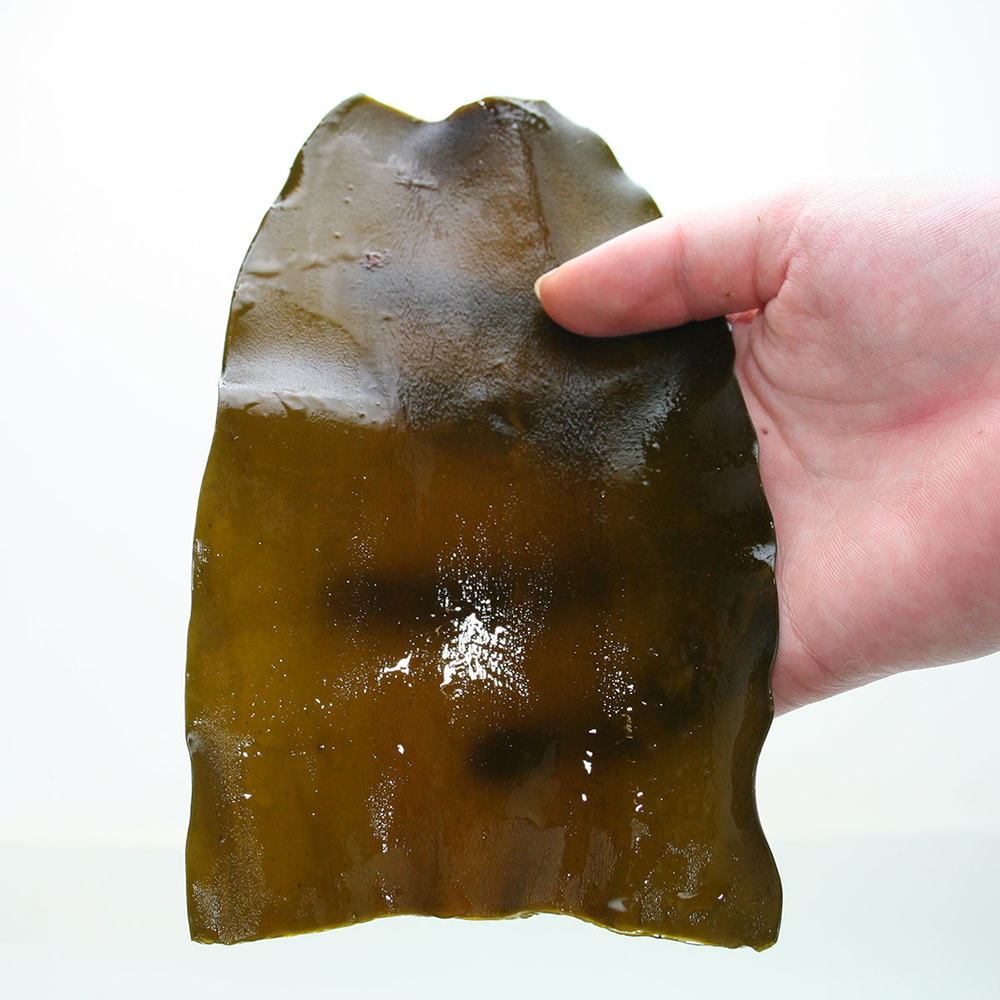 | 上の出し昆布を15分間水につけてみたところ、こんなに大きくなりました。長さは少ししか大きくなっていませんが、幅は約2倍ほどになっています。 これは昆布の豆知識として「釧路産野菜昆布」のページでもご紹介したのですが、昆布を戻したとき大きくなる方向は決まっていて、幅方向にだけ大きくなるというのが種類が違っても当てはまっているのですね。 |