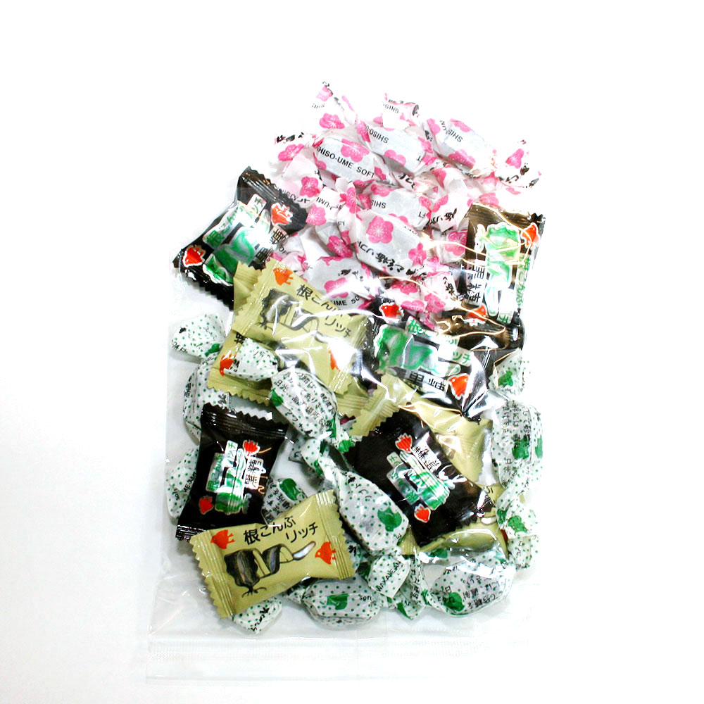 わかめ飴、しそ梅、根昆布リッチ、根昆布リッチ黒糖の4種類をセットにしました。素朴な口当たりとソフトな食感で食べだすと止まりません。